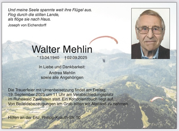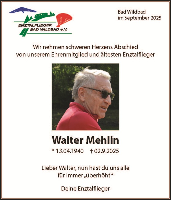 Wir nehmen schweren Herzens Abschied von unserem ältesten Enztalflieger, Ehrenmitglied, Fliegerkameraden und Freund Walter Mehlin (*13.04.1940 – †02.09.2025).